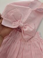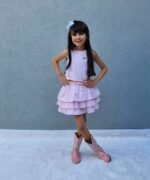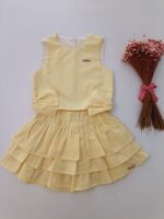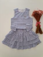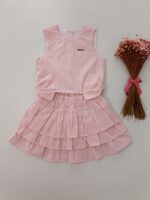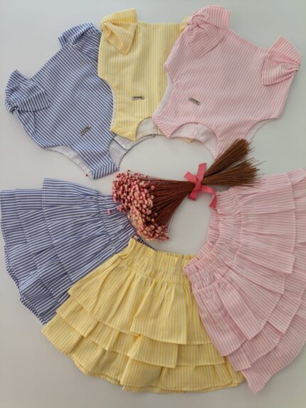 Conjunto confeccionado em tricoline fio tinto 100% algodão, saia de babados, cropped com laços na cintura e abotoamento nas costas.