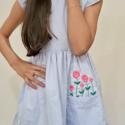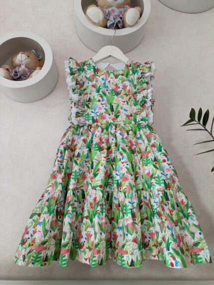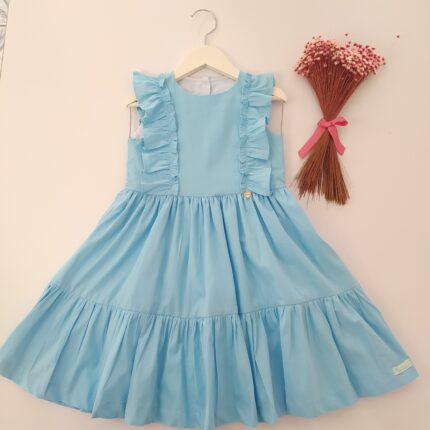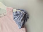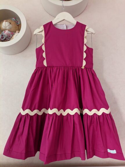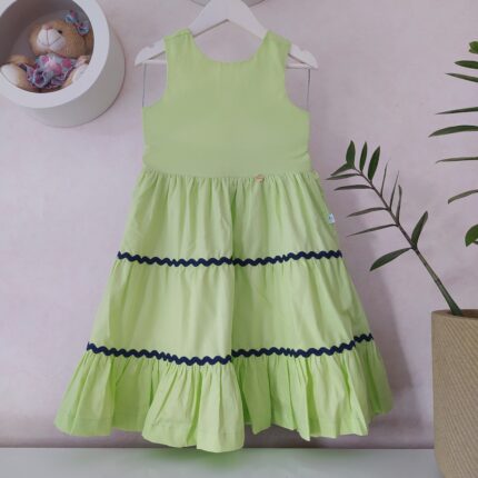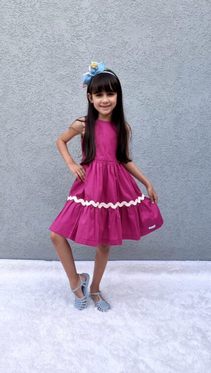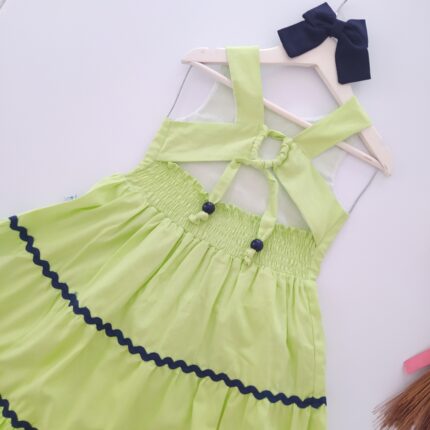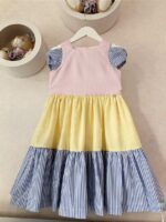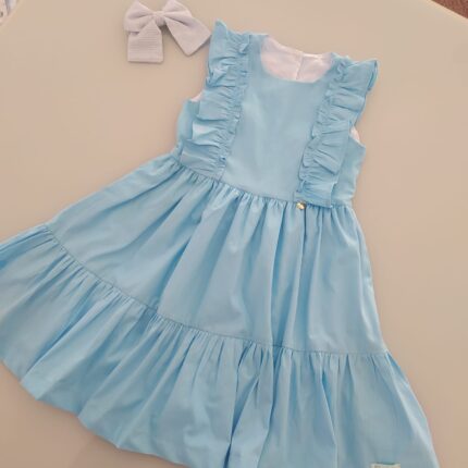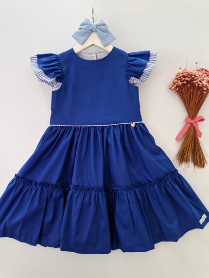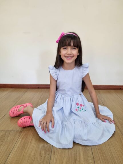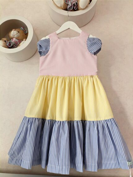 Vestido Alice confeccionado em tricoline 100% algodão, fio tinto listrado em três cores(rosa, amarelo, azul), mangas de laço, abotoamento nas costas, forro em cambraia de algodão.